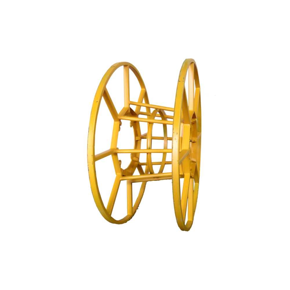 Welded and painted steel conical reel with openable side.